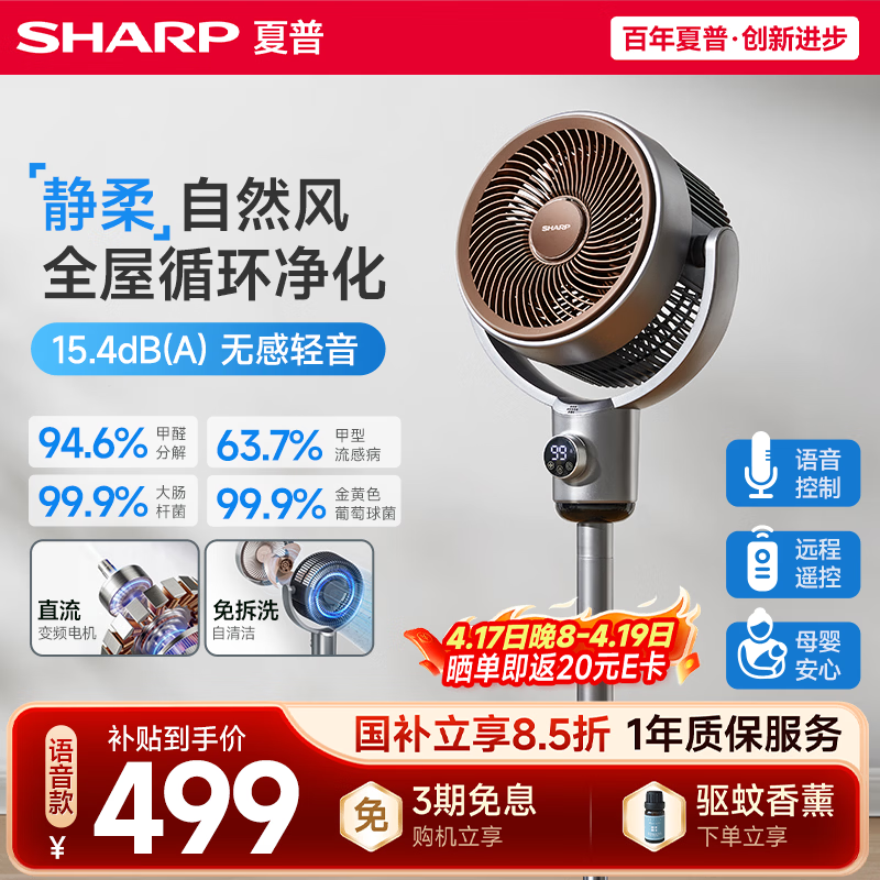 夏普风精灵空气循环扇电风扇落地扇家用卧室大风力静轻音一级能效净化甲醛语音电扇PJ-CD537A-H