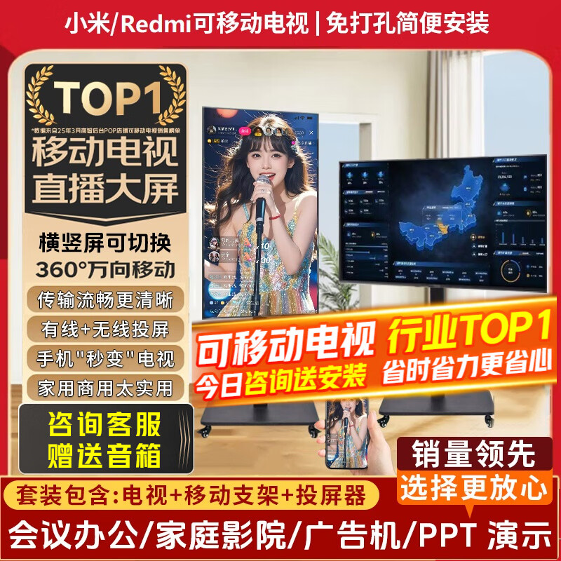 小米(MI)可移动电视闺蜜机直播大屏随心投屏广告机32/43/50/55/65/75/85英寸家用平板显示器落地支架一体机 65英寸 【可移动电视】电视+移动支架+无线投屏器