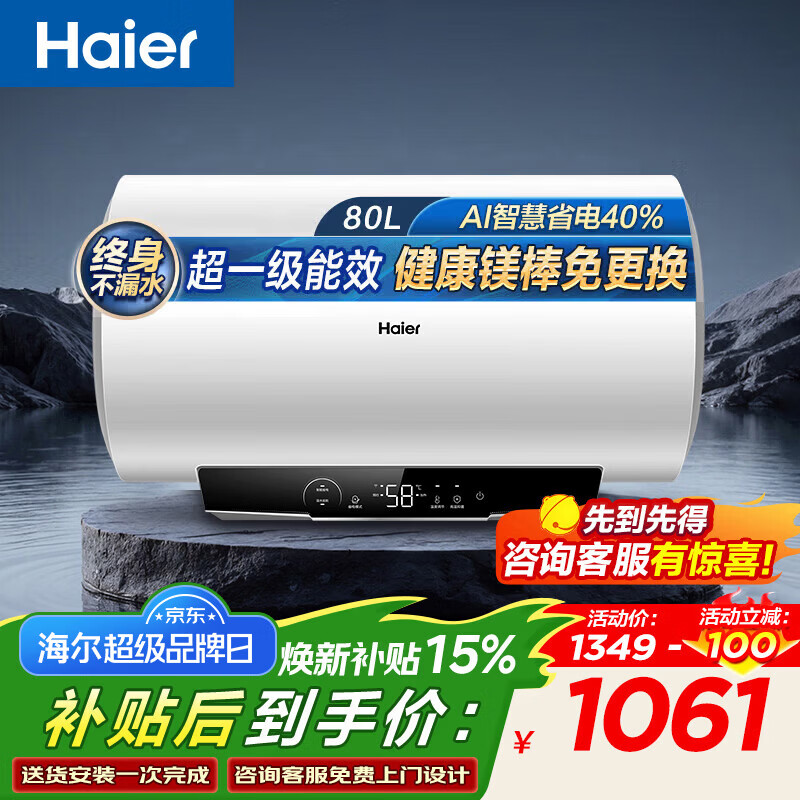 海尔(Haier)热水器60升电热水器【咨询客服享补贴】镁棒免更换2200W速热 超一级能效家用储水式大水量R3 80L 3300W 【镁棒免更换】MC3PRO