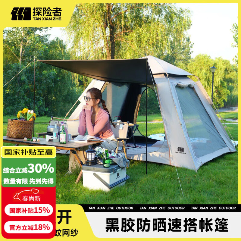 探险者(TAN XIAN ZHE)帐篷户外露营防雨过夜3人-4人速开便捷天幕二合一黑胶防晒帐篷 4-6人黑胶遮阳帐篷【高效防晒】