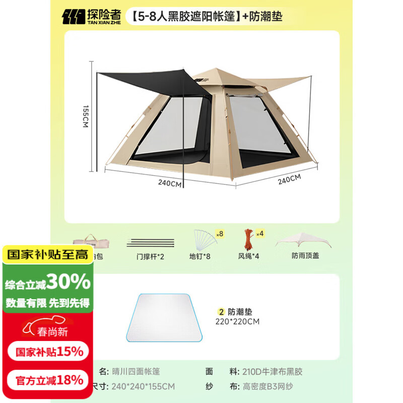 探险者(TAN XIAN ZHE)帐篷户外露营防雨过夜3人-4人速开便捷天幕二合一黑胶防晒帐篷 【5-8人黑胶遮阳帐篷】+防潮垫