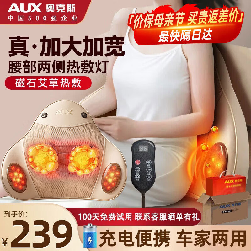奥克斯(AUX)腰部按摩器腰部按摩仪颈腰椎按摩靠垫热敷腰肌劳损背部按摩枕办公生日父母亲节礼物实用送妈妈爸爸 【礼盒遥控款】充电无线便携+升级电机+氖灯红外热敷 父亲母亲节礼物高端实用送妈妈老婆爸爸母亲礼品