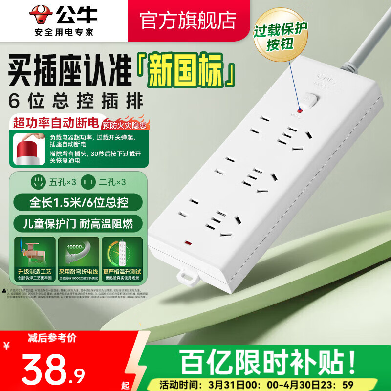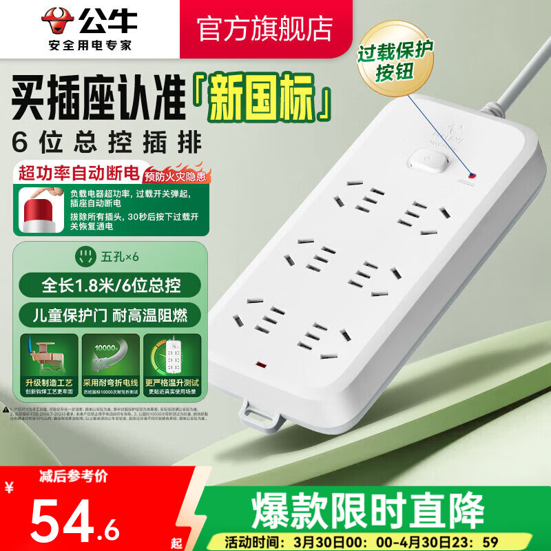 公牛(BULL) 插座/B5系列 带儿童保护门/新国标插座/排插 【6位】总控1.8米(新国标防过载)B5060