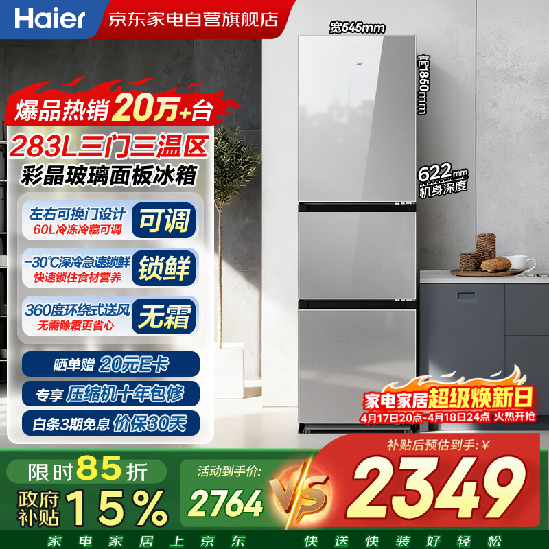 海尔冰箱283升三门玻璃门一级能效双变频左右开门切换三温区风冷无霜家用BCD-283WLHC357SW以旧换新