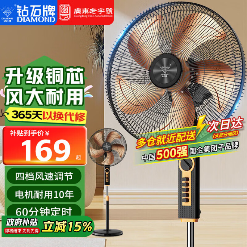 钻石牌(DIAMOND)电风扇落地扇家用风扇立式大风力客厅落地风扇宿舍办公室摇头轻音劲风远距电扇定时 16寸铝叶机械【铜芯线】