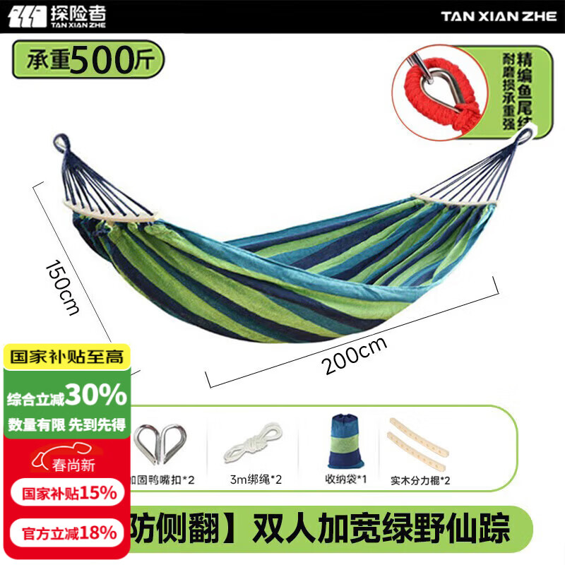 探险者(TAN XIAN ZHE)吊床户外秋千室内单人吊床双人吊床加宽加厚帆布秋千宿舍吊床 【升级防侧翻】双人加宽绿野仙踪