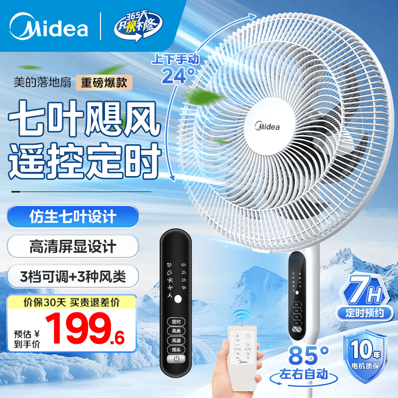美的(Midea)电风扇落地扇家用大风量 远距离强风送凉电电扇 立式落地风扇家用卧室客厅办公 可选升级2级能效 【白色遥控】7h定时35BR