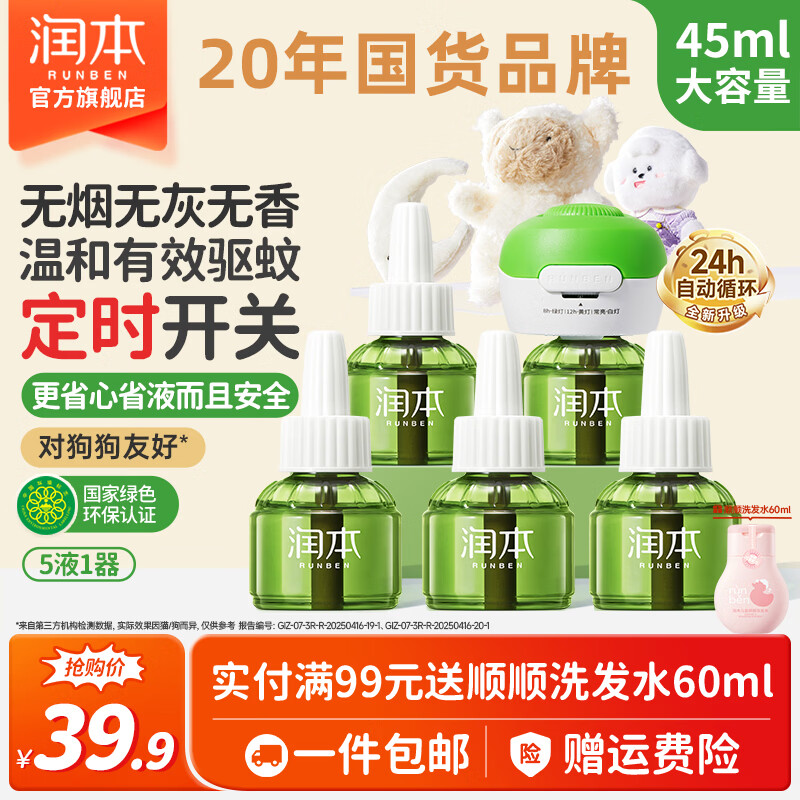 润本蚊香液电蚊香液驱蚊液定时加热器驱蚊防蚊蚊香无香型驱蚊水 【3档定时-1居室推荐】无味5液+1器