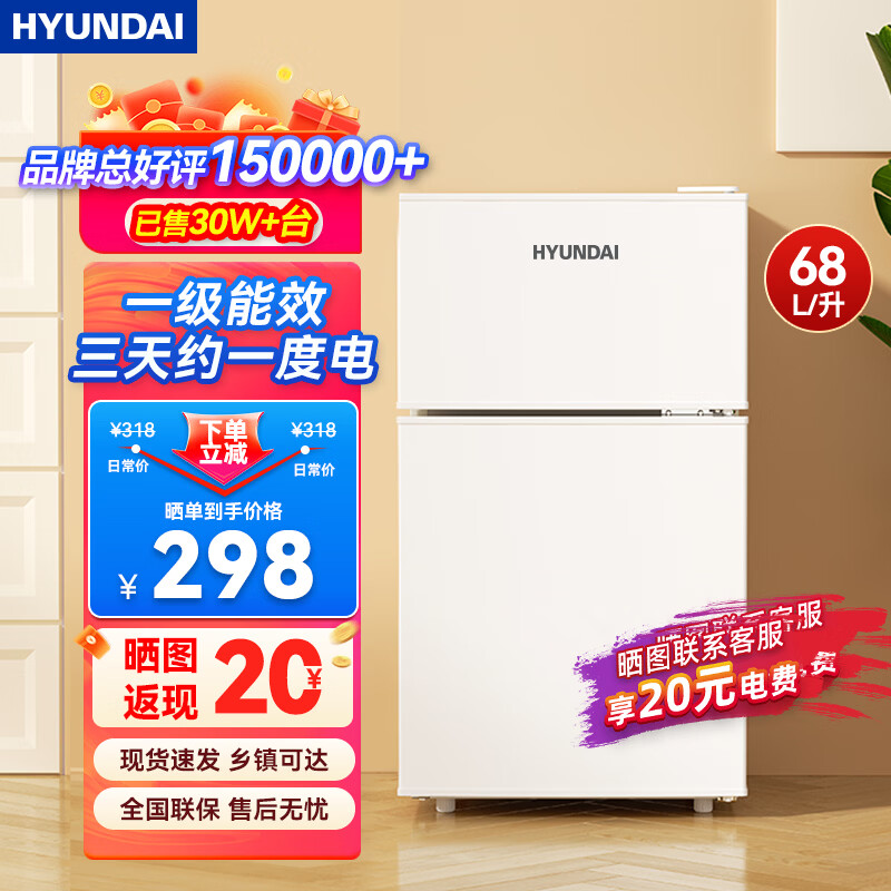 HYUNDAI(韩国现代)小冰箱迷你小型家用冷藏冷冻宿舍出租房办公室双开门二门电冰箱节能省电 68L白【一级能效+租房必备】