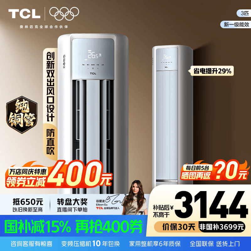 TCL空调 新一级能效 真省电SE柜机 节能空调冷暖 客厅立式大风量圆柱型家用空调 以旧换新国家补贴 京东联名真省电 SE 3匹 柜机