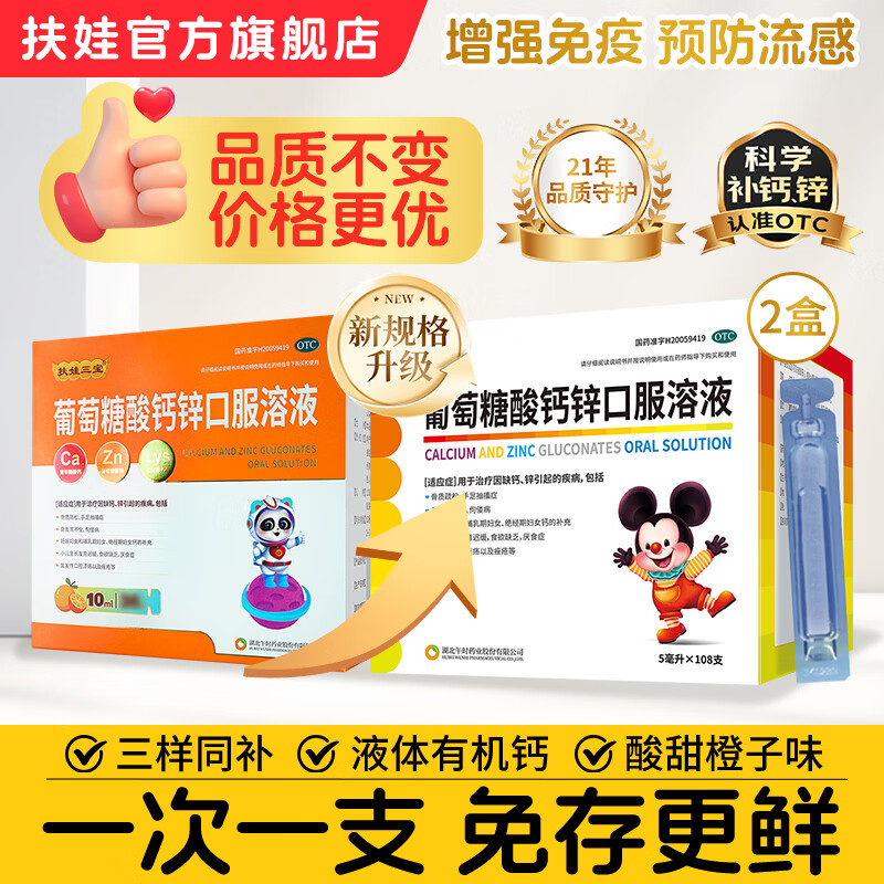 [扶娃]葡萄糖酸钙锌口服溶液 5ml*108支 2盒装 5ml*108支/盒儿童钙液体钙 骨发育不全 厌食症 缺钙锌 发育迟缓 春季补钙 一支补三样