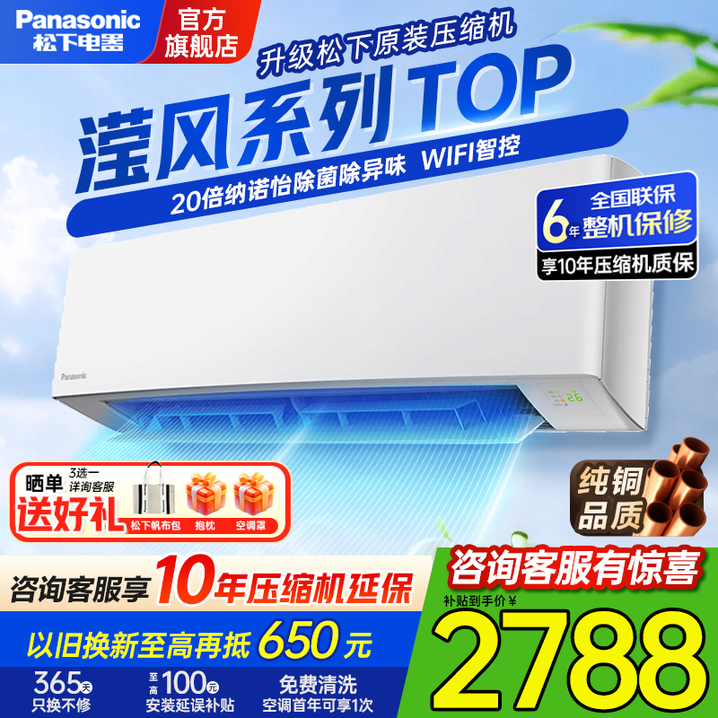 松下(Panasonic)滢风三代1匹/1.5匹空调挂机纯铜管直流变频冷暖纳诺怡除菌家用壁挂式原装压缩机以旧换新补贴 滢风 大1匹 滢风三代五重升级【JM26K430Q】