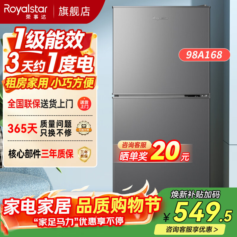 荣事达(Royalstar)小冰箱小型家用出租房双门一级能效宿舍冷藏冷冻两用节能电冰箱 98A168【一级能效】【三天不到1度电】灰
