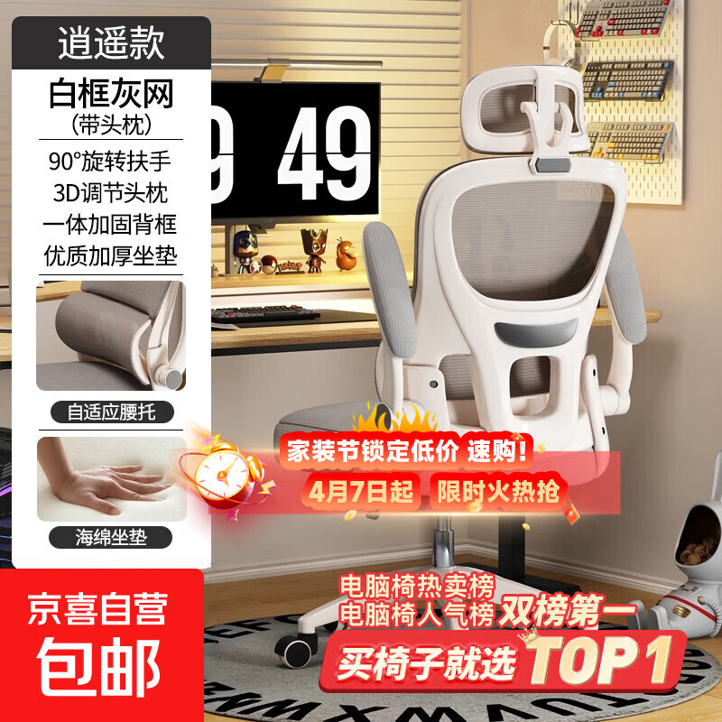 人体工学椅子护腰电脑椅靠背椅电竞椅学习办公椅座椅 豪华逍遥款-灰色【头枕+海绵垫】