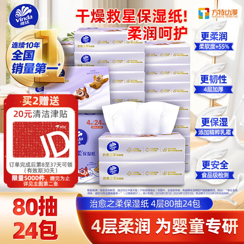 维达(Vinda)抽纸 保湿纸巾4层80抽*24包 加厚婴儿乳霜纸云柔巾 宝宝专用 整箱