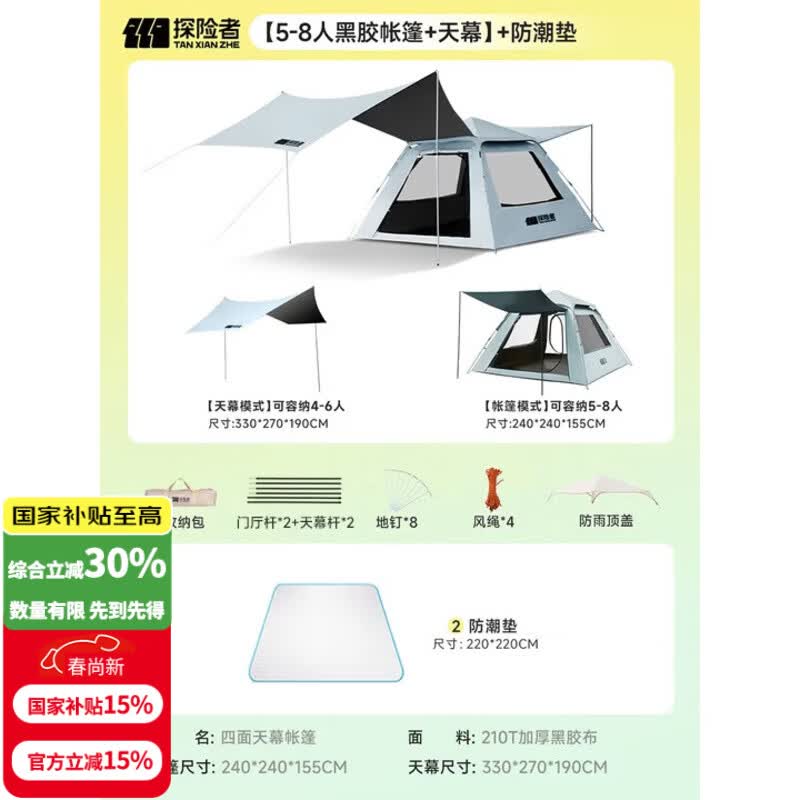 探险者(TAN XIAN ZHE)帐篷户外露营防雨过夜3人-4人速开便捷天幕二合一黑胶防晒帐篷 【5-8人黑胶帐篷+天幕】+防潮垫