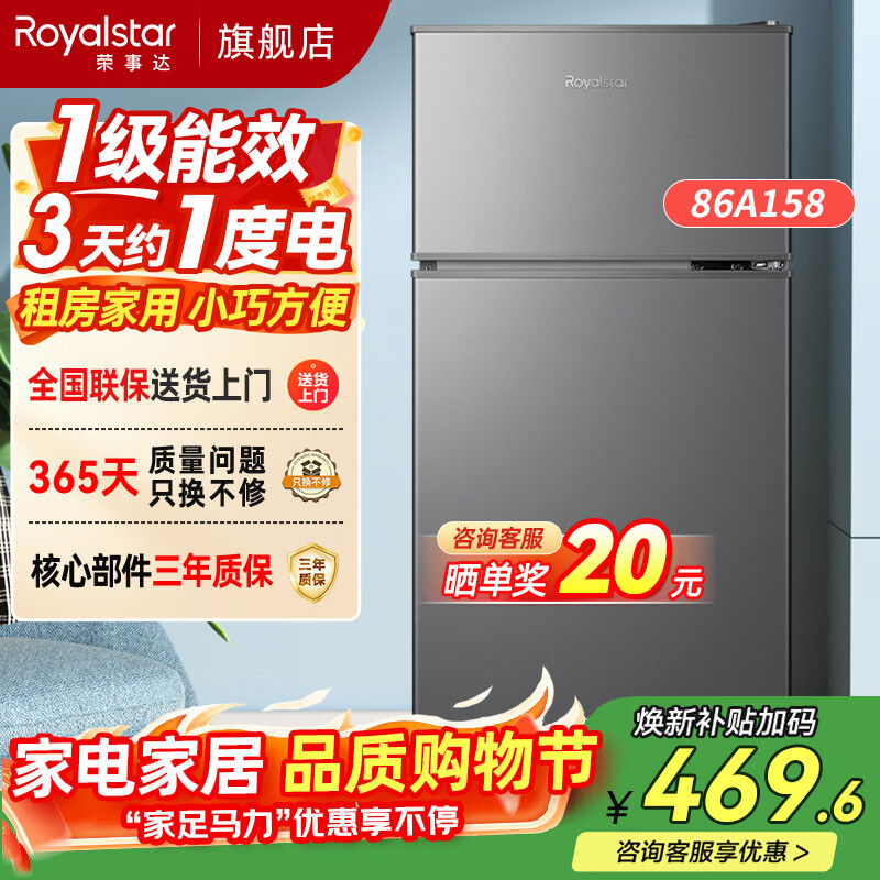 荣事达(Royalstar)小冰箱小型家用出租房双门一级能效宿舍冷藏冷冻两用节能电冰箱 86A158【一级能效】【三天不到1度电】灰