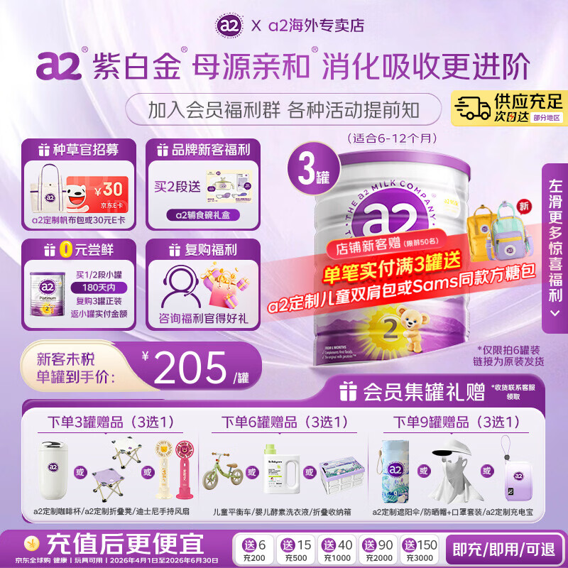 a2奶粉紫白金版 新西兰原装进口婴儿配方奶粉 含天然A2【至初同源】 【店铺新客加赠】2段 900g 3罐 效期至27年11月