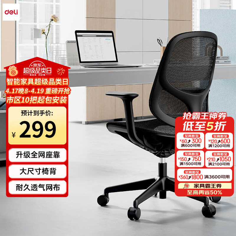 得力(deli)4900U人体工学职员网椅 全网电脑椅会议椅舒适办公可升降转椅(黑)
