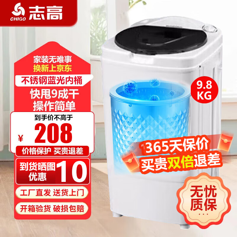 志高【热销Top1】脱水机单甩干脱水机干桶甩干机小型迷你家用甩干桶出租房宿舍大容量脱水桶烘干 9.8公斤【加厚不锈钢蓝光内桶】质保三年 波轮