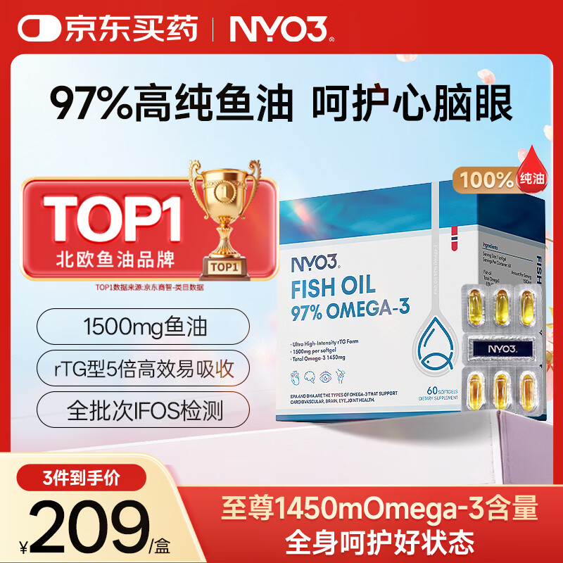NYO3 97%鱼油 Omega-3 呵护心脑眼 60粒/盒