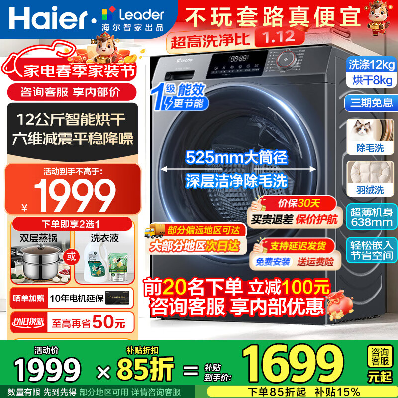 海尔(Haier)12公斤滚筒洗衣机全自动洗烘一体大容量超薄机身除菌螨一级能效省水省电667NH/50DS换新补贴洗衣机 【海尔12公斤667】大筒径+除毛洗 滚筒洗烘 统帅