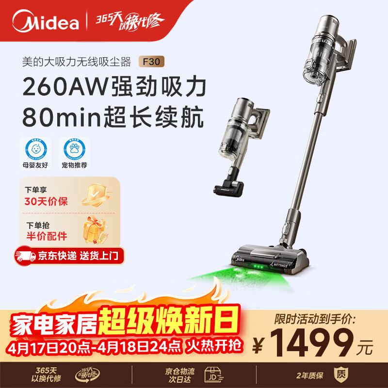 美的(Midea)吸尘器家用F30无线手持吸尘器 绿光显尘 除螨除尘车载轻量大吸力