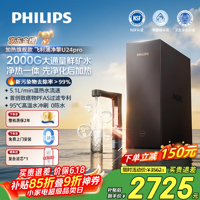 飞利浦(PHILIPS)加热净水器净擎U24Pro 1000G矿物质水 5.1L/min热水流速等效2000G直饮厨下即滤净饮机AUT8011