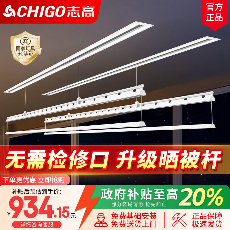 志高(CHIGO)电动隐形晾衣架吊顶阳台家用升降隐藏式晾衣架嵌入式智能晾衣机 【双杆】白色1.8米+72W照明+语音