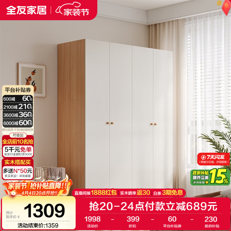 全友家居简约奶油风四门衣柜次卧室家用靠墙落地柜子成品衣橱政府补贴