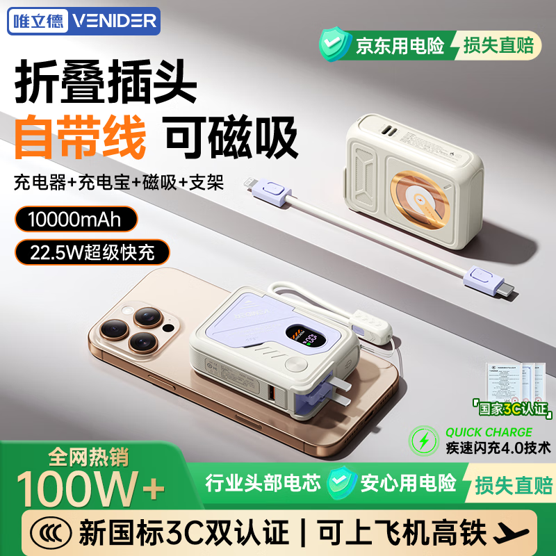 VENIDER【国家3C安全认证】【可上飞机高铁】磁吸充电宝20000mAh超级快充自带线移动电源适用苹果小米 【1万毫安时+磁吸+AC插头+自带线】香芋紫