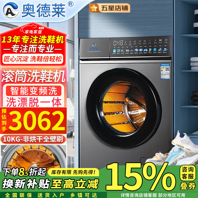 奥德莱(AOD)【补贴85折】滚筒洗鞋机全自动洗脱一体烘干家用刷鞋机洗鞋子神器专业自动洗鞋机洗烘一体免拆鞋带 10KG变频滚筒-洗脱一体-非烘干-全壁刷-灰色款