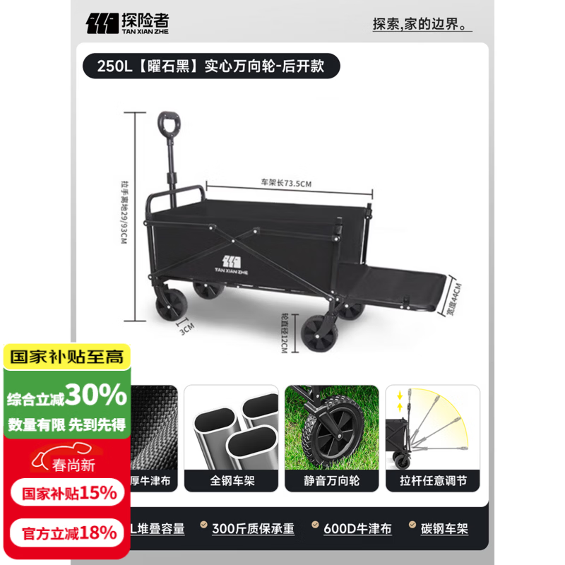 探险者(TAN XIAN ZHE)户外露营小推车折叠露营推车营地拖车野餐桌板手拉车摆摊快递车 250L 曜石黑--实心万向轮-后开款