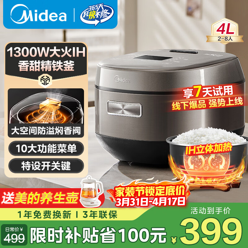 美的(Midea)电饭煲4l/5升家用ih立体加热1300W大火力香甜精铁厚釜智能电饭锅柴火饭上盖可拆3-4-5-6-8-10个人 4L 【线下同款】仿古IH灶火 | 精铁厚釜