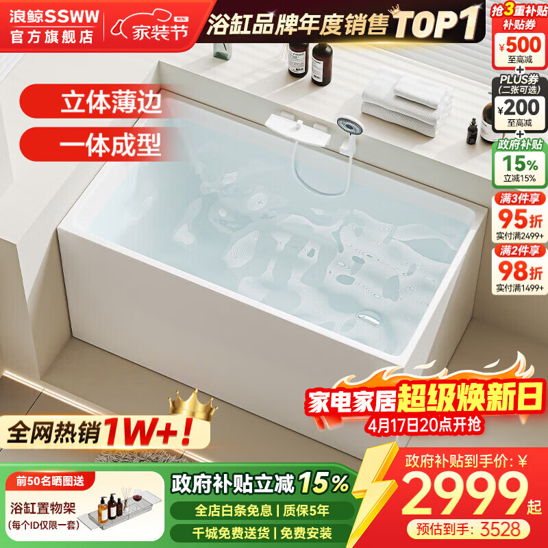 浪鲸(SSWW)卫浴独立式小户型浴缸家用成人亚克力深泡方形薄边泡澡浴池缸1051 1.7米独立式空缸