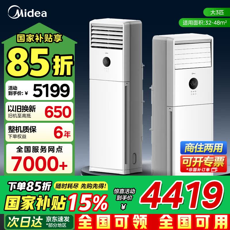 美的(Midea)空调立式大3匹新能效商用方柜省电变频冷暖上出风客大风口方形柜机客厅企业空调以旧换新餐厅柜机 制冷王 一级能效 大3匹 方形柜机