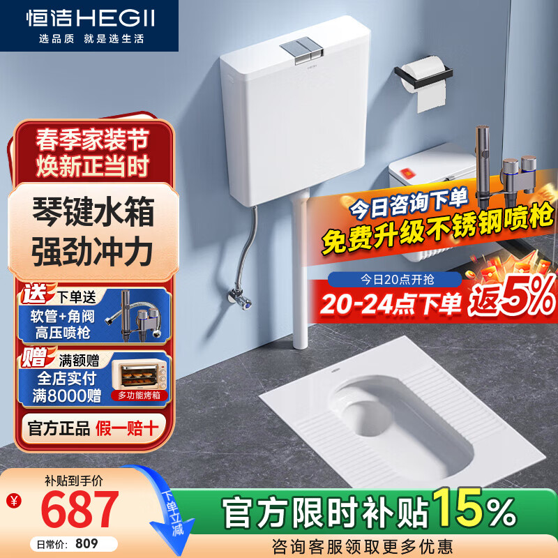 恒洁(HEGII)专利款蹲便器水箱套装超薄防溅防臭卫生间蹲便蹲坑蹲厕大便器3026 3026B蹲便器+6050琴键大冲力水箱套装