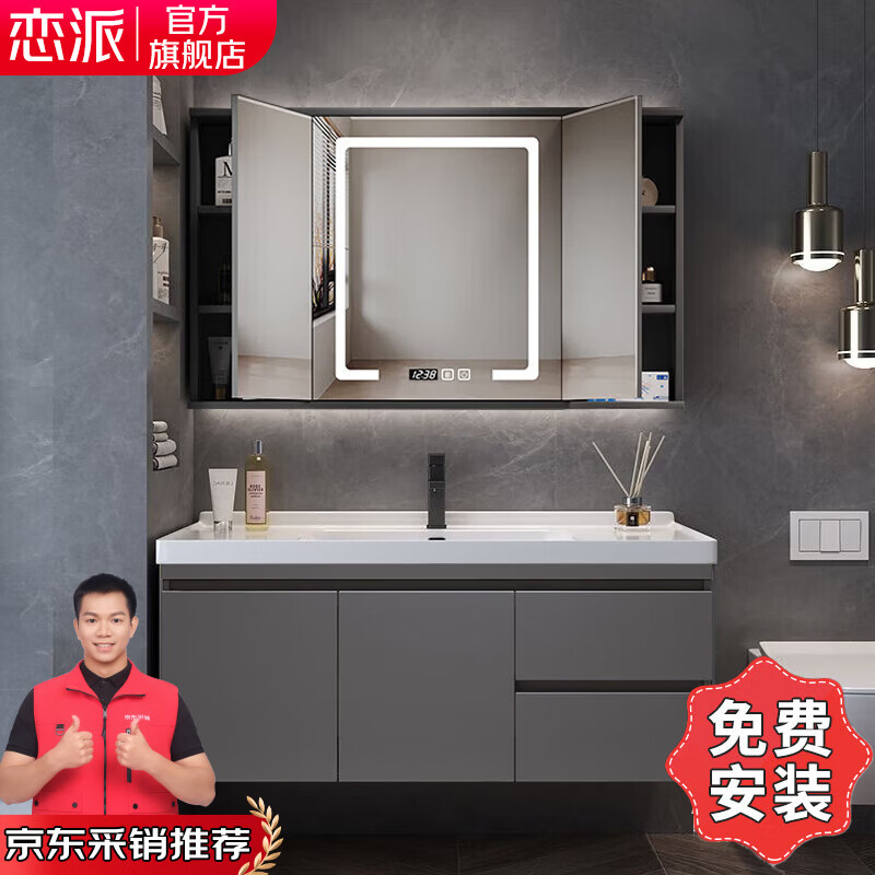 恋派浴室柜 陶瓷一体盆卫生间洗脸盆柜组合悬挂式洗漱台智能洗手盆柜 风水镜柜】珠光灰+陶瓷盆 100cm