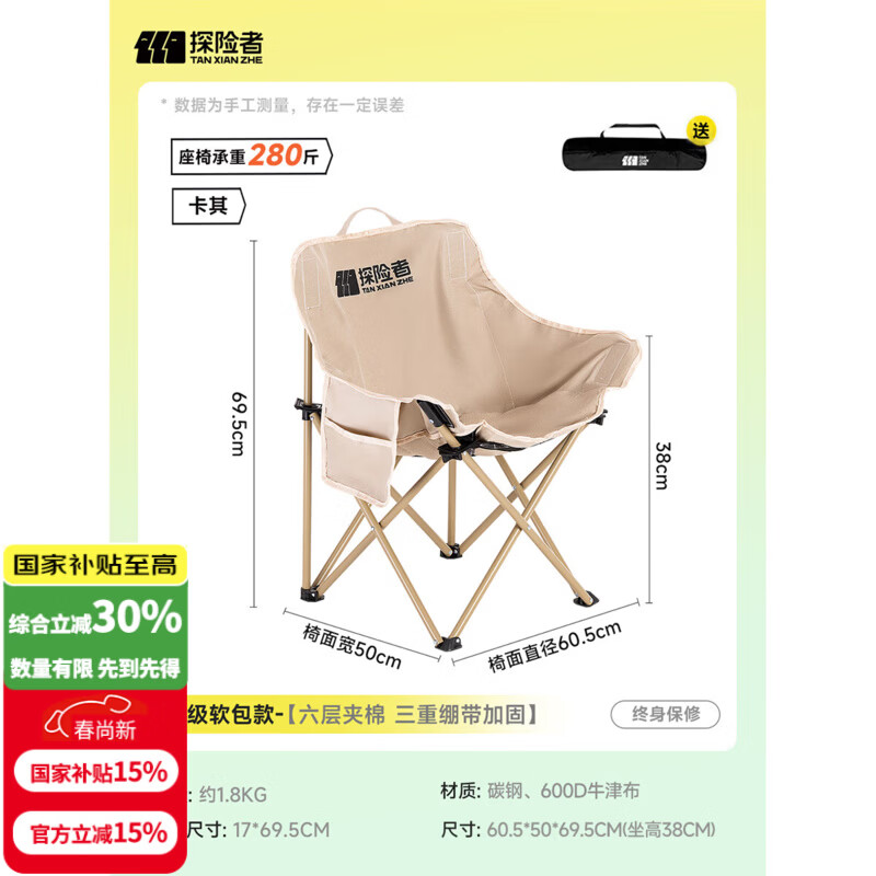 探险者(TAN XIAN ZHE)户外折叠椅露营椅子月亮椅便携折叠桌椅高靠背躺椅小凳子钓鱼椅 升级软包款卡其【六层夹棉】