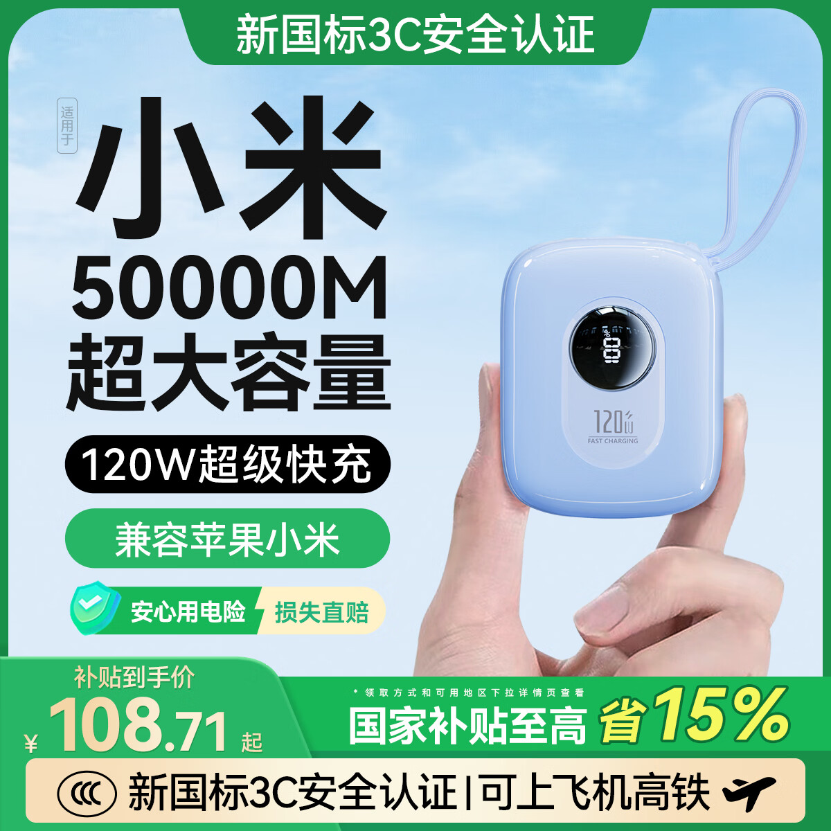 威顿【50000M顶配丨国标3C认证】适用小米充电宝20000毫安大容量可上飞机小巧便携自带线120W超级快充 30000M【天空蓝+8.0超级闪充+进口电芯】 【新3C认证|可上飞机】适用苹果/小米/安卓