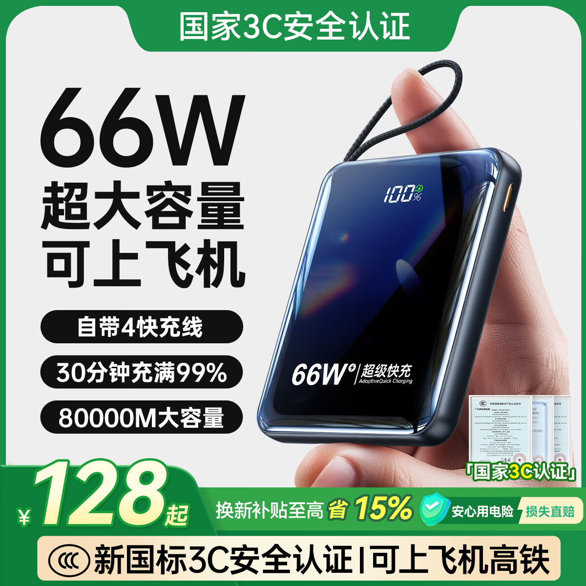 威顿【80000M顶配丨新国家3C认证】充电宝66W超级快充大容量可上飞机自带线移动电源20000毫安小巧便携 【80000M】66W超级快充丨进口电芯 国家3C认证丨可上飞机丨自带四线