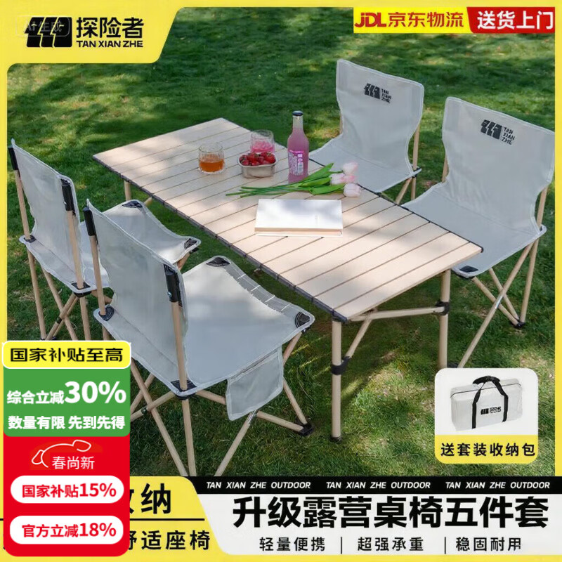 探险者(TAN XIAN ZHE)露营桌椅露营装备全套一体户外桌椅套装便携折叠桌子四椅子野餐桌 【120CM】4-8人米白一桌四椅五件套-赠收纳包