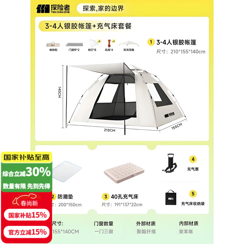 探险者帐篷户外露营防雨过夜3人-4人便携式折叠露营帐篷全自动加厚防晒 帐篷3-4人带充气垫套餐