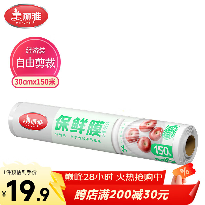美丽雅一次性保鲜膜大号经济装30cm*150米 食品级家庭用PE材质安全卫生
