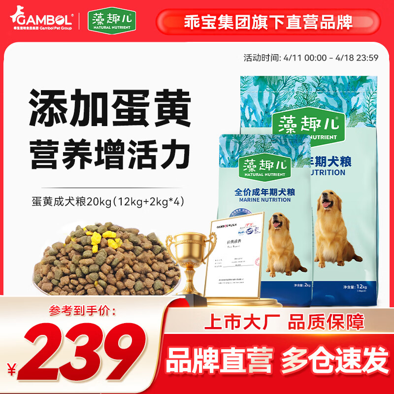 藻趣儿 狗粮 通用全价犬粮小中大型犬泰迪柯基金毛拉布拉多 【新升级蛋黄双拼】成犬粮40斤装