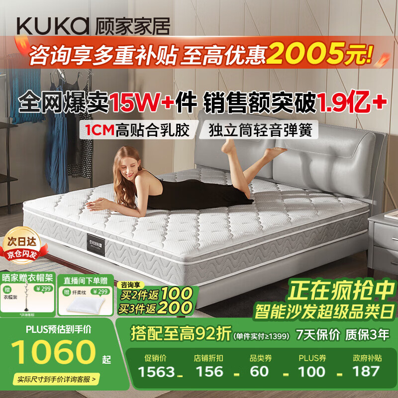 顾家家居(KUKA)梦想垫旗舰版天然乳胶独袋弹簧床垫主次卧0001J软硬适中1.5x2米