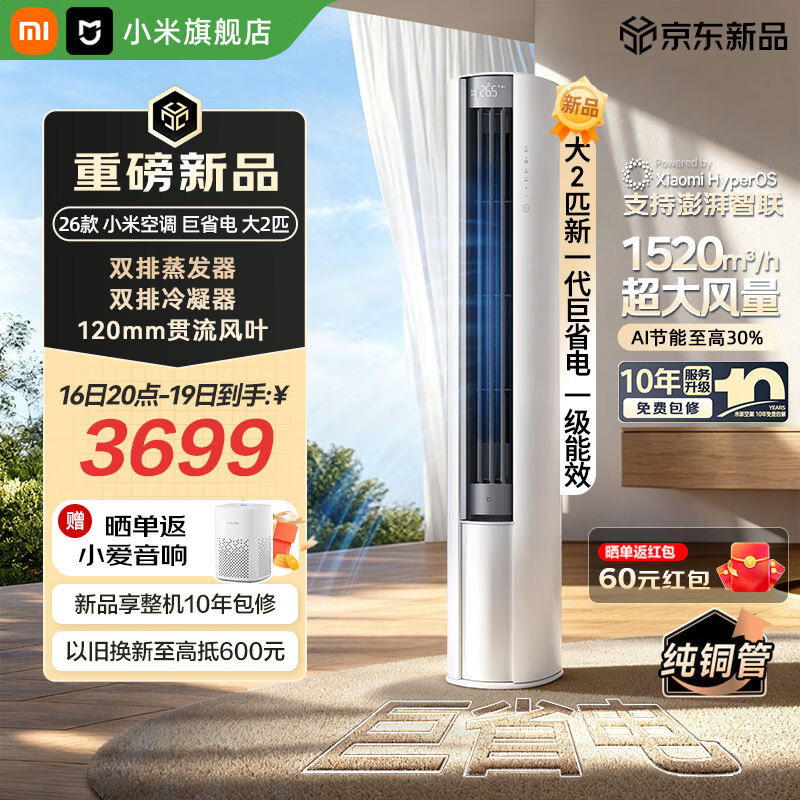 小米(MI)空调米家 3匹 巨省电Pro 大风口柜机 新一级能效 智能自清洁 智能互联 冷暖变频 家用立式圆柱柜机 大2匹 新一级能效 巨省电大风口 26款