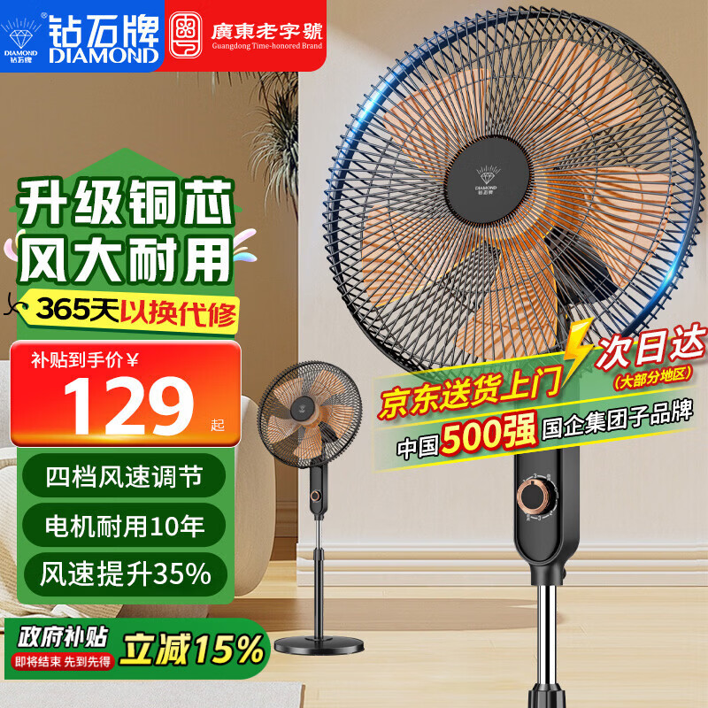 钻石牌(DIAMOND)电风扇落地扇家用风扇立式大风力客厅落地风扇宿舍办公室摇头轻音劲风远距电扇定时 14寸五叶机械【铜芯电机】