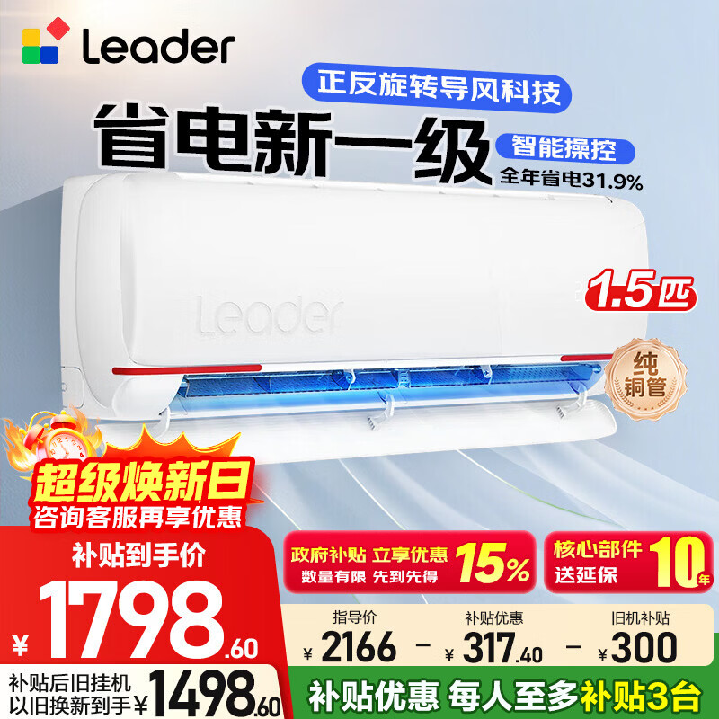 海尔空调出品统帅1.5匹/2匹/3匹一级能效超省电节能制冷暖热变频自清洁纯铜管家用大挂机以旧换新补贴 1.5匹 一级能效 热销元气款+双翼全域风