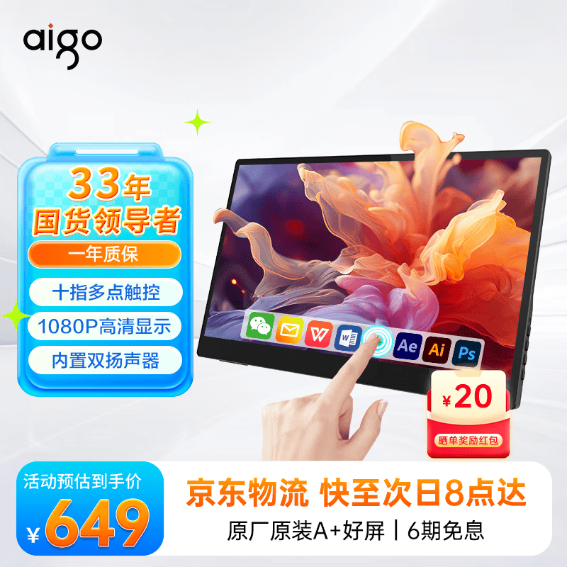 爱国者aigo便携显示器 IPS电脑手机便携屏笔记本支架显示屏扩展屏 PS4/5 Switch副屏Type-C一线通 15.6英寸/触摸屏款/高清1080P
